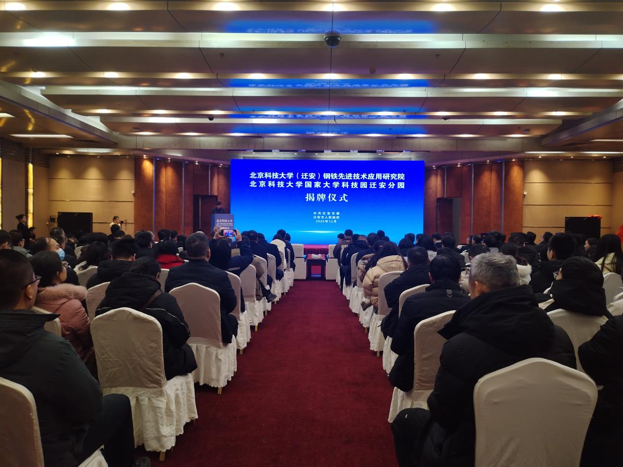 揭牌仪式上张卫冬、王艳军、赵秀爽、王斌共同为“北京科技大学(迁安)钢铁先进技术应用研究院”和“北京科技大学国家大学科技园迁安分园”揭牌。科技园公司、学校科研人员和迁安企业签署共建“产业技术联合创新研究院”合作协议和技术开发合作协议。